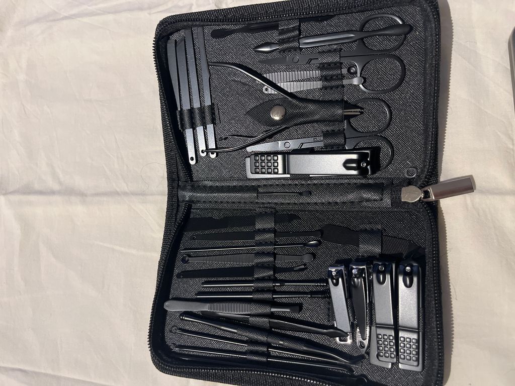 Beskrivning av Manikyr set smidigt manikyrset med 32 nagelverktyg i ett svart läderfodral med dragkedja.